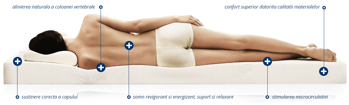 un confort superior; sustinere corecta a corpului in toate punctele; aliniere naturala a tuturor segmentelor coloanei si suport complet al spatelui; reducere considerabila a presiunilor asupra corpului; stimulare a microcirculatiei sangvine la nivelul pielii; relaxare si detensionare a muschilor; un rasfat demn de ... un cap incoronat!